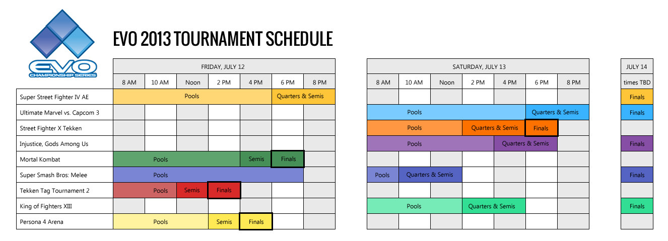 EVO 2013 is quickly approaching, hopefully all of you competitive Fighting Game player’s are busy grinding it out to the best of your ability. This year will be one of the most competitive EVO’s without a doubt. With so many new grudges, rivalries, and more forming the past year, it will be quite interesting to see the turn outs at this years EVO. Luckily, today Mr.Wizard released the official schedule for this years EVO so all of you can plan ahead the only unfortunate part is that pools for Injustice start at 8am for all of you non-early birds. But anyway, for all of those that may need to plan it is, here is the official schedule layout for all official EVO games.
