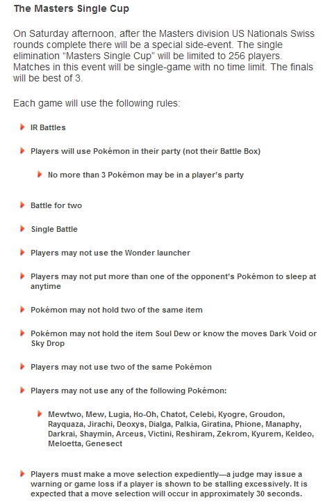 Competitive Pokemon fans, good news! Looks like Nintendo is doing more innovate stuff this year and the VGC Nationals, as they have just recently announced that they will be holding a 3v3 Singles Masters Cup tournament, as a side event. The event will be taking place on Saturday July 6th, with Registration at 2pm, and the tournament beginning at 4pm. Rules can be found in the image below.